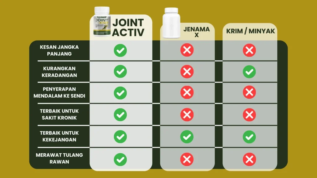 JointActiv adalah yang paling murah di pasaran berbanding produk sendi di pasaran. Serta penggunaan yang mudah kerana JointActiv dalam bentuk kapsul biasa.
